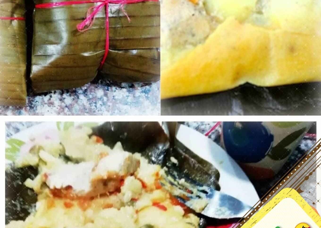 - Ahora sí, la parte divertida; vamos a ARMAR LOS TAMALES: Primero ponemos dos hojas cruzadas ✖️ una sobre la otra. Luego ponemos un poco de masa, una rodaja de papa 🥔 y una de zanahoria 🥕, un trozo de carne 🐽 y uno de pollo 🐔; una cucharada de guiso, medio huevo 🥚 cocinado y otro poco de masa. Cerramos el tamal, cuidando que el relleno no se salga y listos para ir a la olla 😊. Si quedan un poco sueltos los pueden amarrar con hilo o cabuya