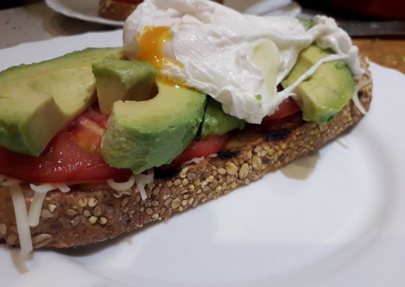 - Una vez tostado el pan ponemos un chorrito de aceite de oliva, el queso rallado (al gusto), las rodajas de tomate y las rodajas de aguacate.
