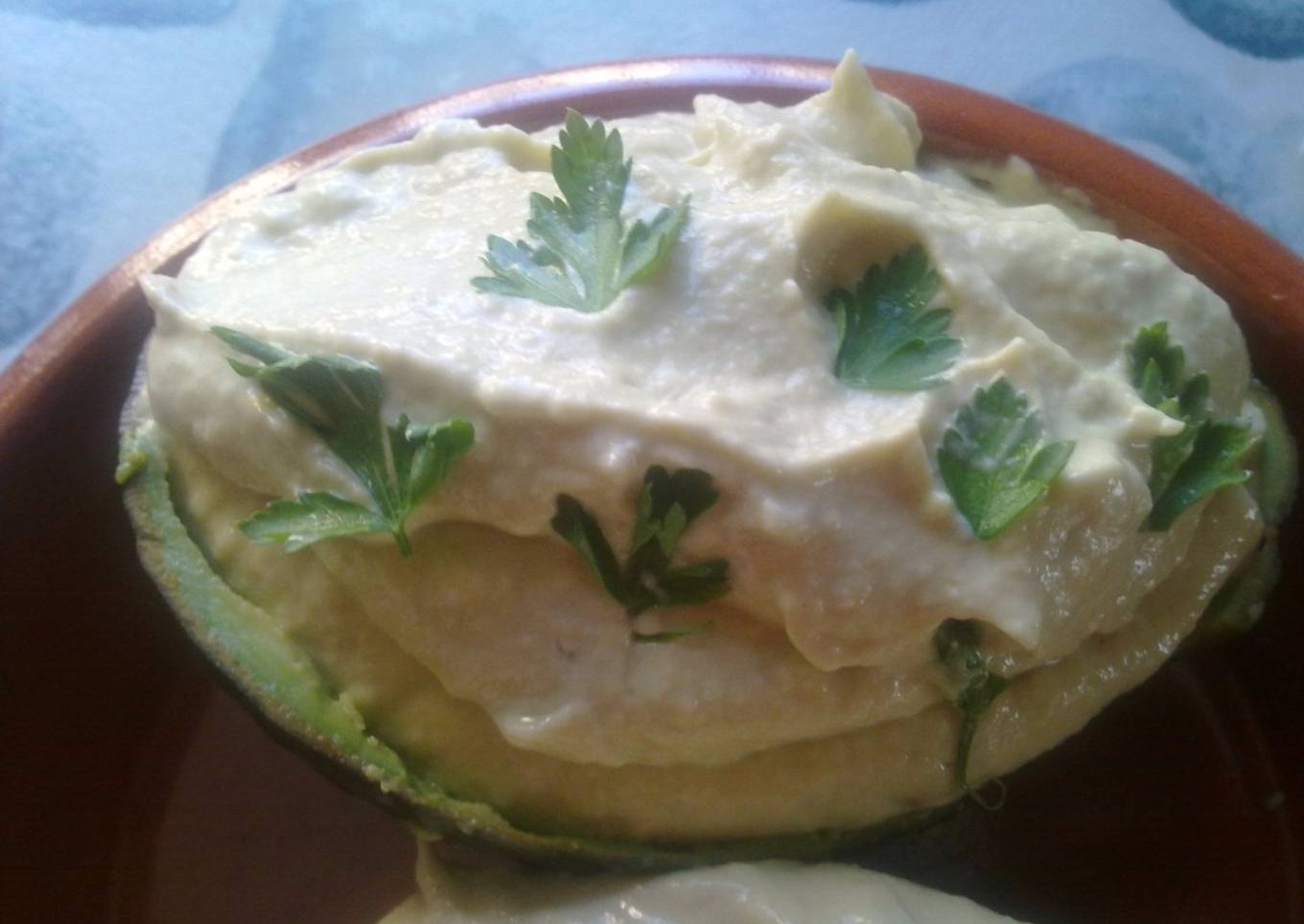 - Se añade la mayonesa de ajo y se tritura con la batidora. Se rellenan las dos cascaras del aguacate con el contenido del vaso de la batidora. Se decora con hojitas de perejil fresco y se deja reposar hasta la hora de comer en el frigorífico.