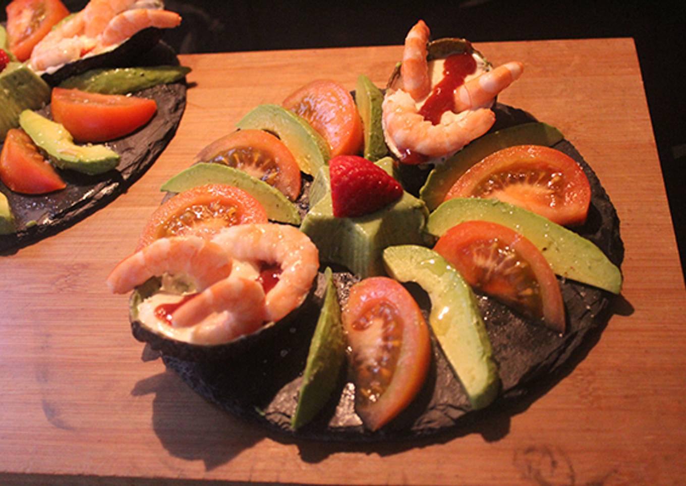 Ensalada de aguacate con gambas y estrellas de pepino y queso