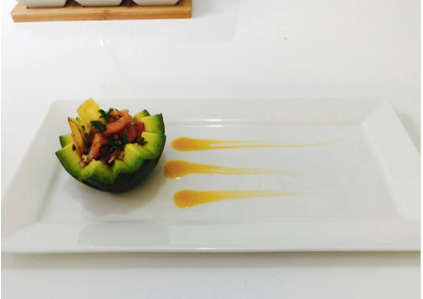 - Mezclar los camarones con el sofrito y servir en el aguacate.