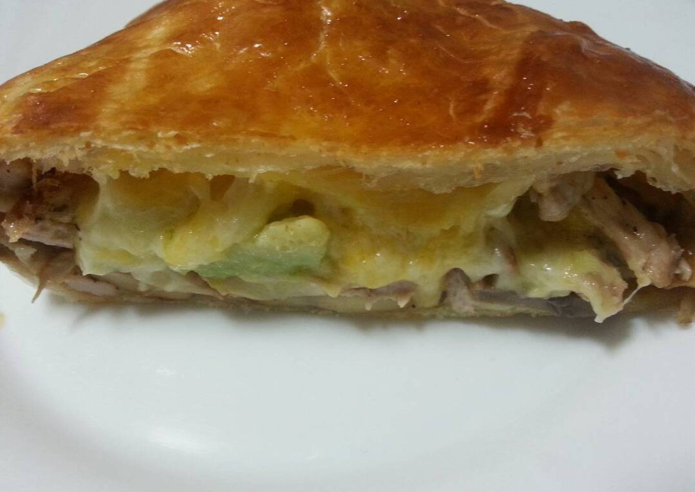- Cubrimos el relleno con la parte libre del hojaldre y cerramos bien los bordes. Pintamos con el huevo batido y llevamos al horno unos minutos.