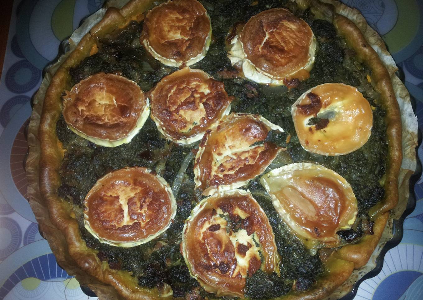 - Colocar la masa quebrada en una fuente de horno, poner la batata en el fondo, a continuación añadir las espinacas con piñones y cortar el queso de cabra a rodajas y se ponen encima de las espinacas.