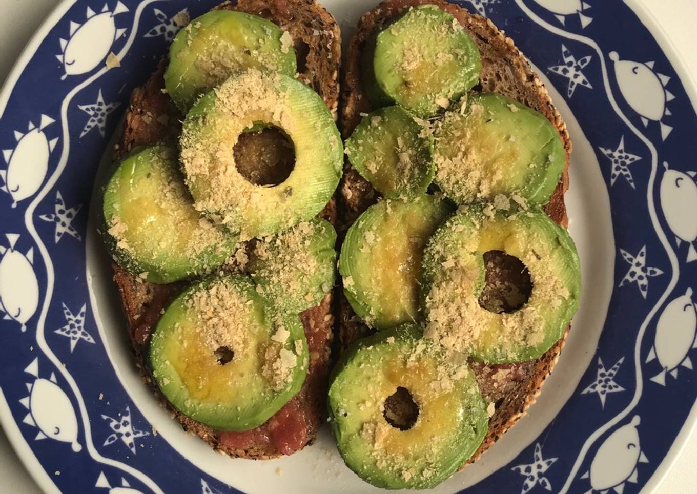 Tostadas con tomate, aguacate y levadura de cerveza