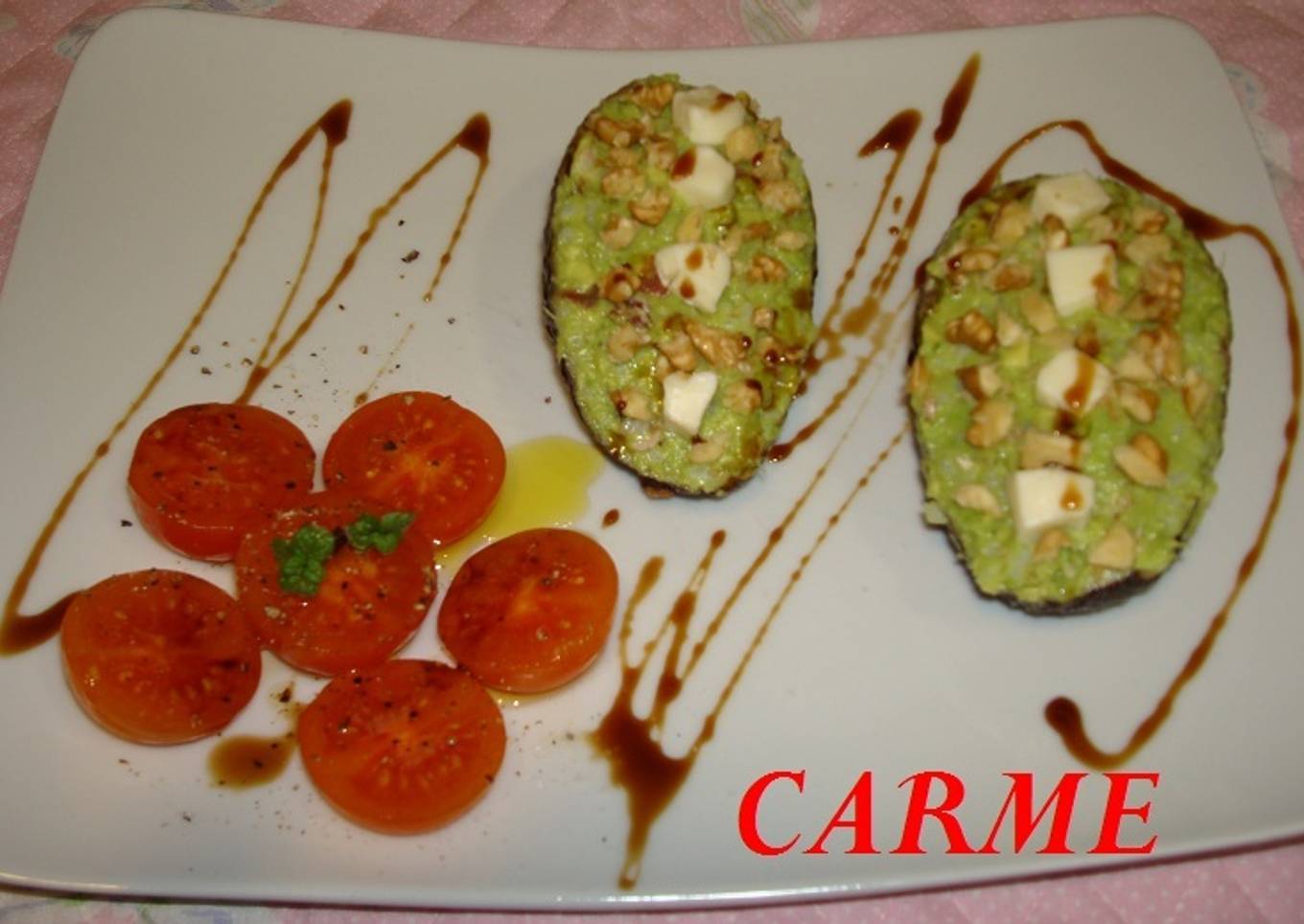 - Mezclar el queso en el bol. Rellenar las dos mitades de aguacate con el relleno que hemos preparado. Decorar con unos daditos de queso y las nueces troceadas.
