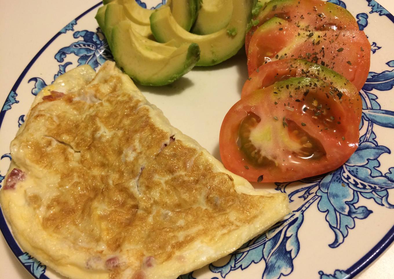 - Mientras se hace la tortilla vamos cortando el aguacate y el tomate en rodajas, o como más os guste. Aliñar el tomate con aceite, un poquito de sal y albahaca.