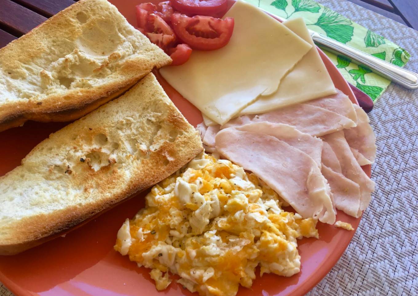 - Montamos el plato con el pan tostado, los huevos revueltos, el tomate partido, las lonchas de pavo y el queso, llevar el aceite de oliva a la mesa para añadir sobre el pan. Y listo para disfrutar de un delicioso desayuno con una buena taza de café recién hecho!!