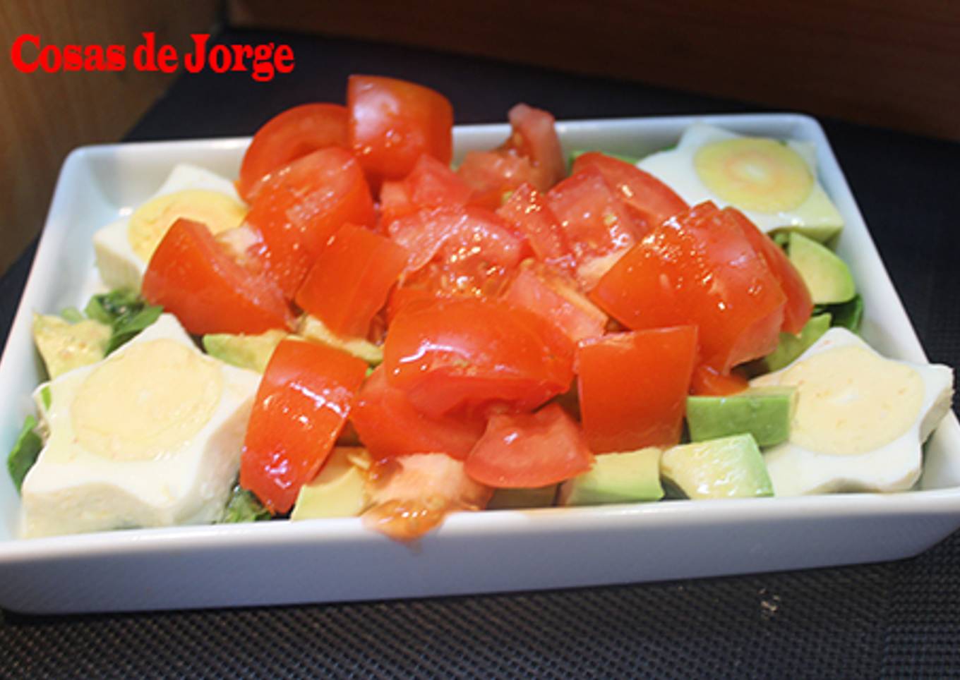 En esta ocasión os presento una extraña ensalada con huevos cocidos con forma de estrella, acompañados de rúcula, canónigos, aguacate y tomate.