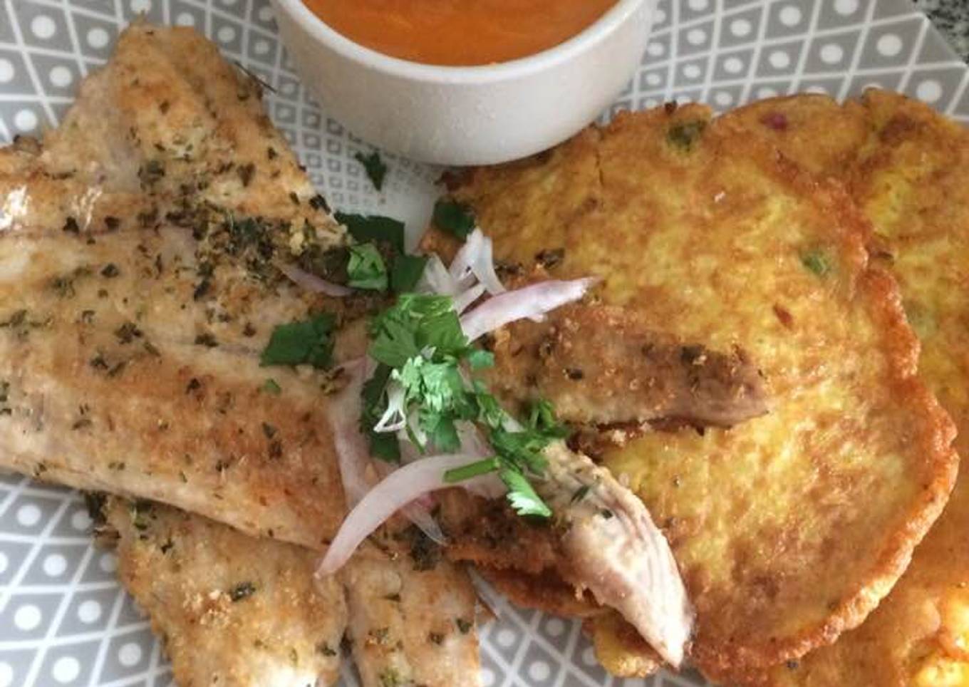Filete de pescado con puré de camote y tortillas de arroz a lo Carmelita