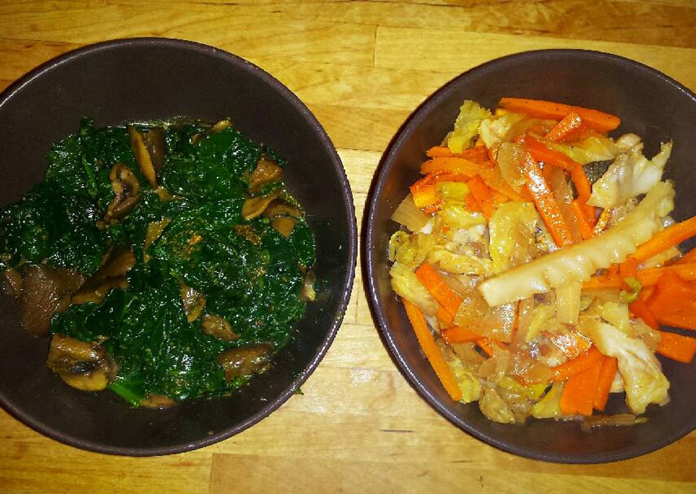 - Poner las espinacas en la olla cuando hierva el agua. Bajar a fuego medio y esperar unos 5 minutos. Mientras lavamos los champiñones y los cortamos en láminas. Añadimos a la sartén con un pelín de aceite, le echamos un poquito de romero y hierbas provenzales a fuego medio le damos unas vueltas y tras colar las espinacas las echamos también. Rehogamos con un pelín de cúrcuma, ajo en polvo y pimienta negra y a comer!