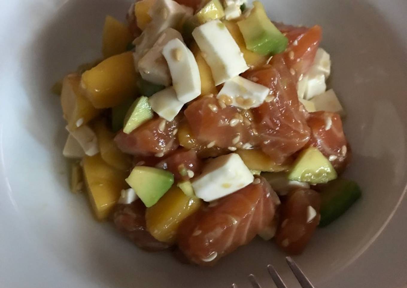 Salmón marinado con mango, aguacate y queso fresco
