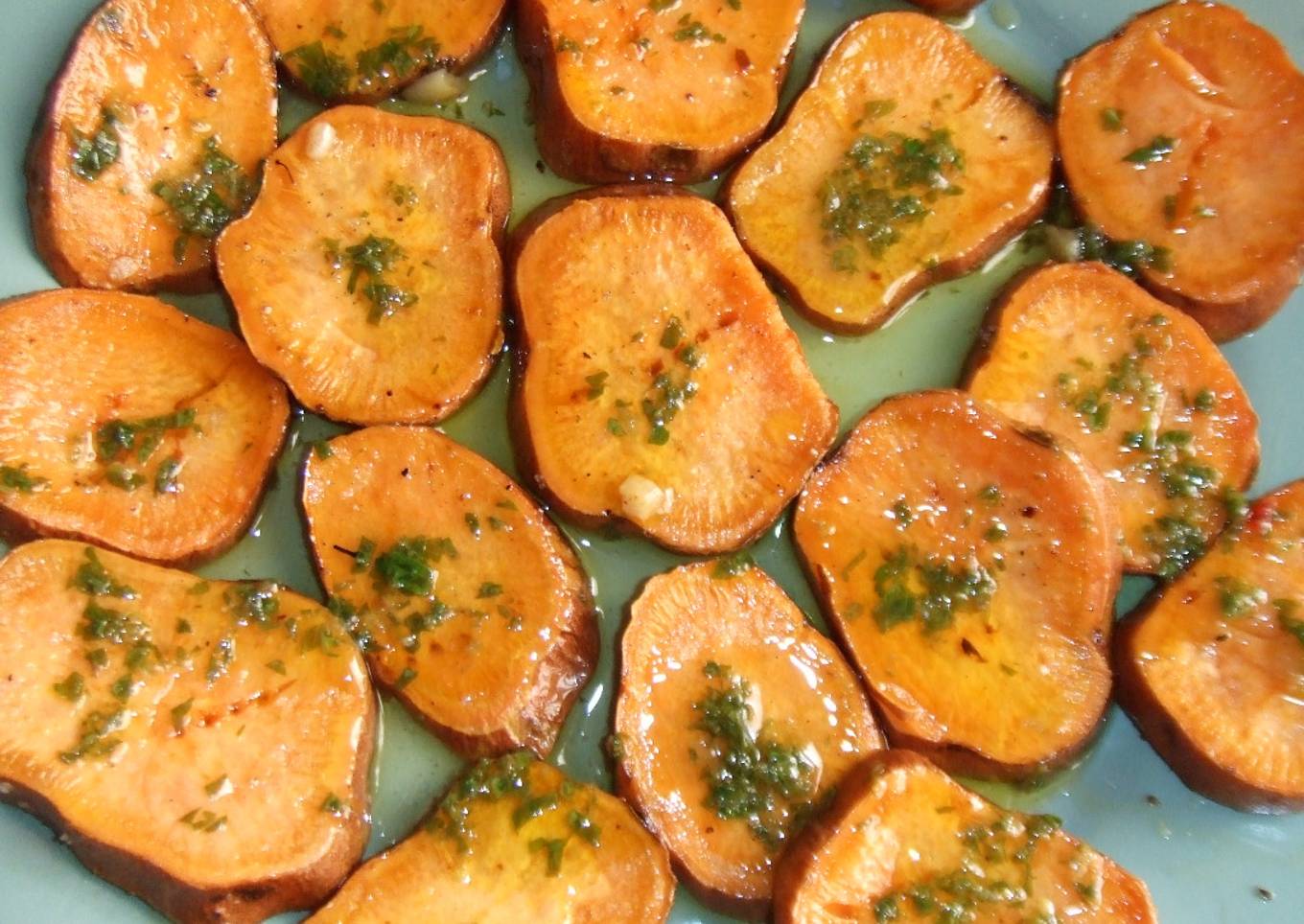 - Colocar las rodajas de batata en una fuente y espolvorear con sal, pimienta rosa y un poquito de ajo y una cucharada de aceite.