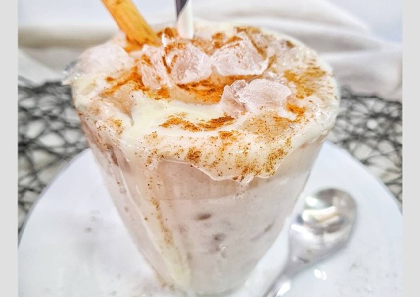 - Para servir coloca en el fondo del vaso hielo triturado, vierte la chicha junto con un poco de leche condensada y canela en polvo. Cubre con hielo triturado