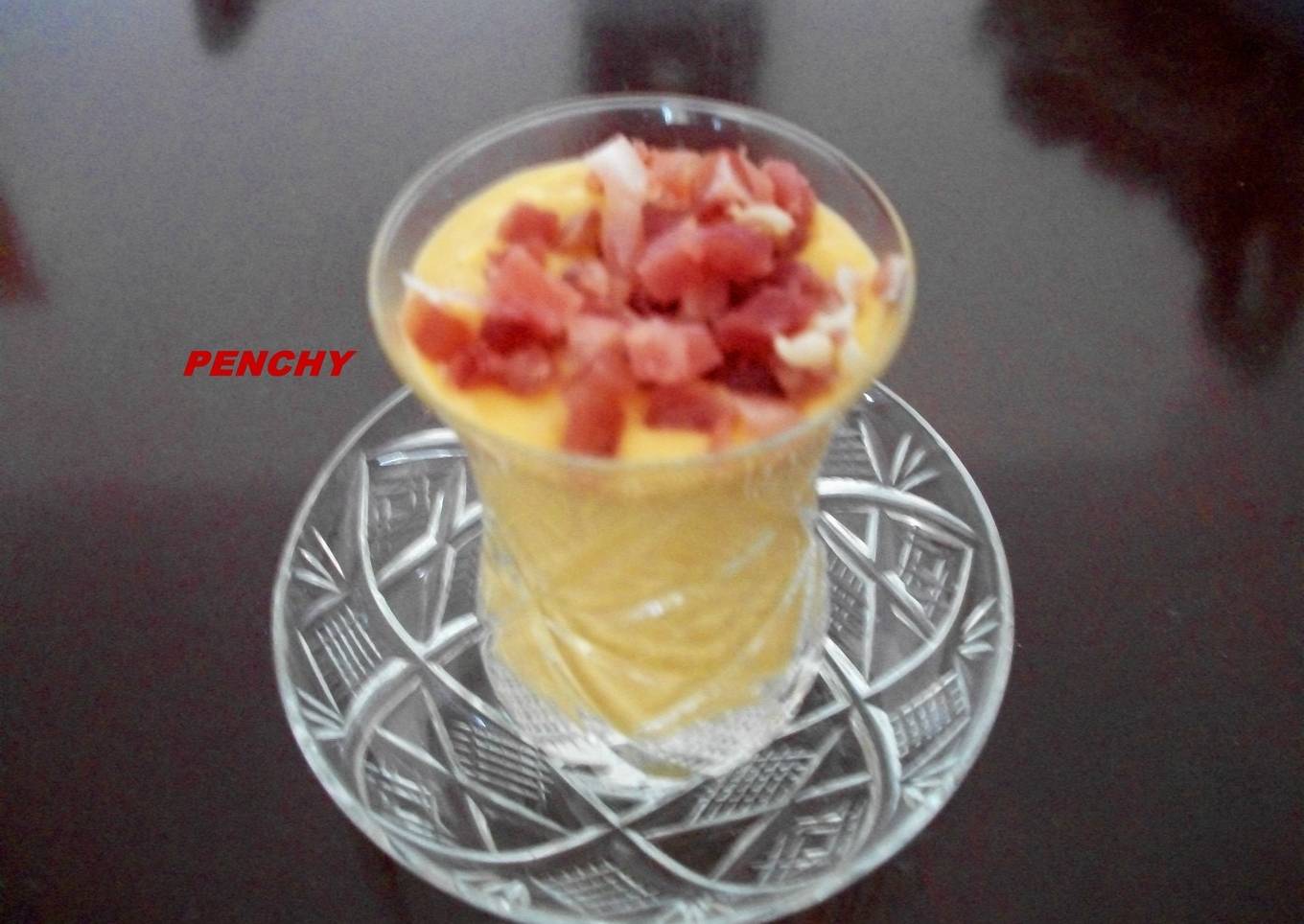 - Batimos hasta conseguir una crema espesita, ponemos en chupitos, espolvoreamos de jamón ibérico picadito y metemos al fresco hasta el momento de servir, QUE APROVECHE.