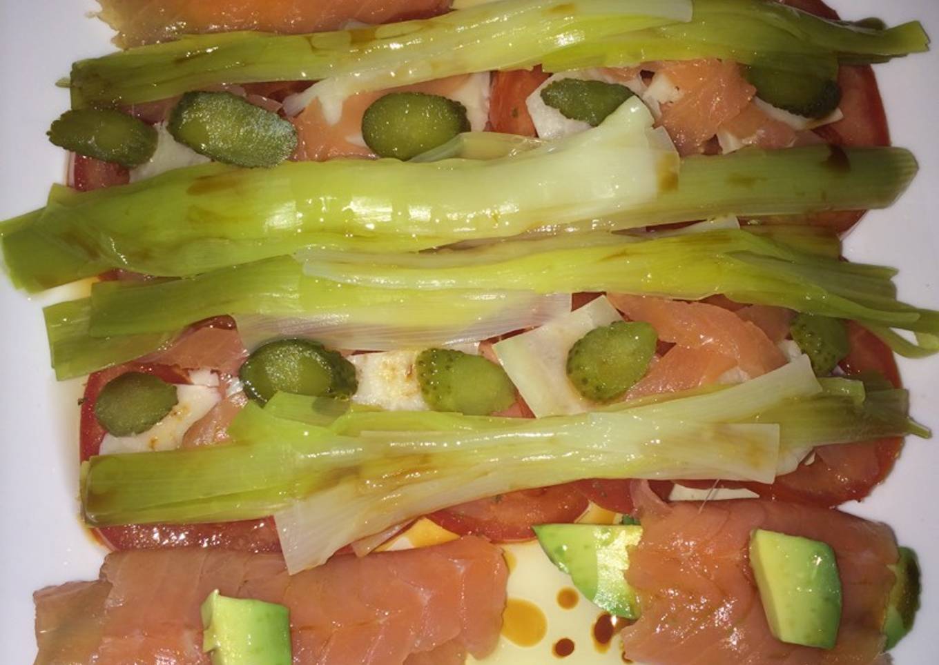 Reservas un poquito de salmón y lo pones por encima de la ensalada. - Incorporas el puerro por encima de la ensalada, y los rollitos de salmón con aguacate a los lados.