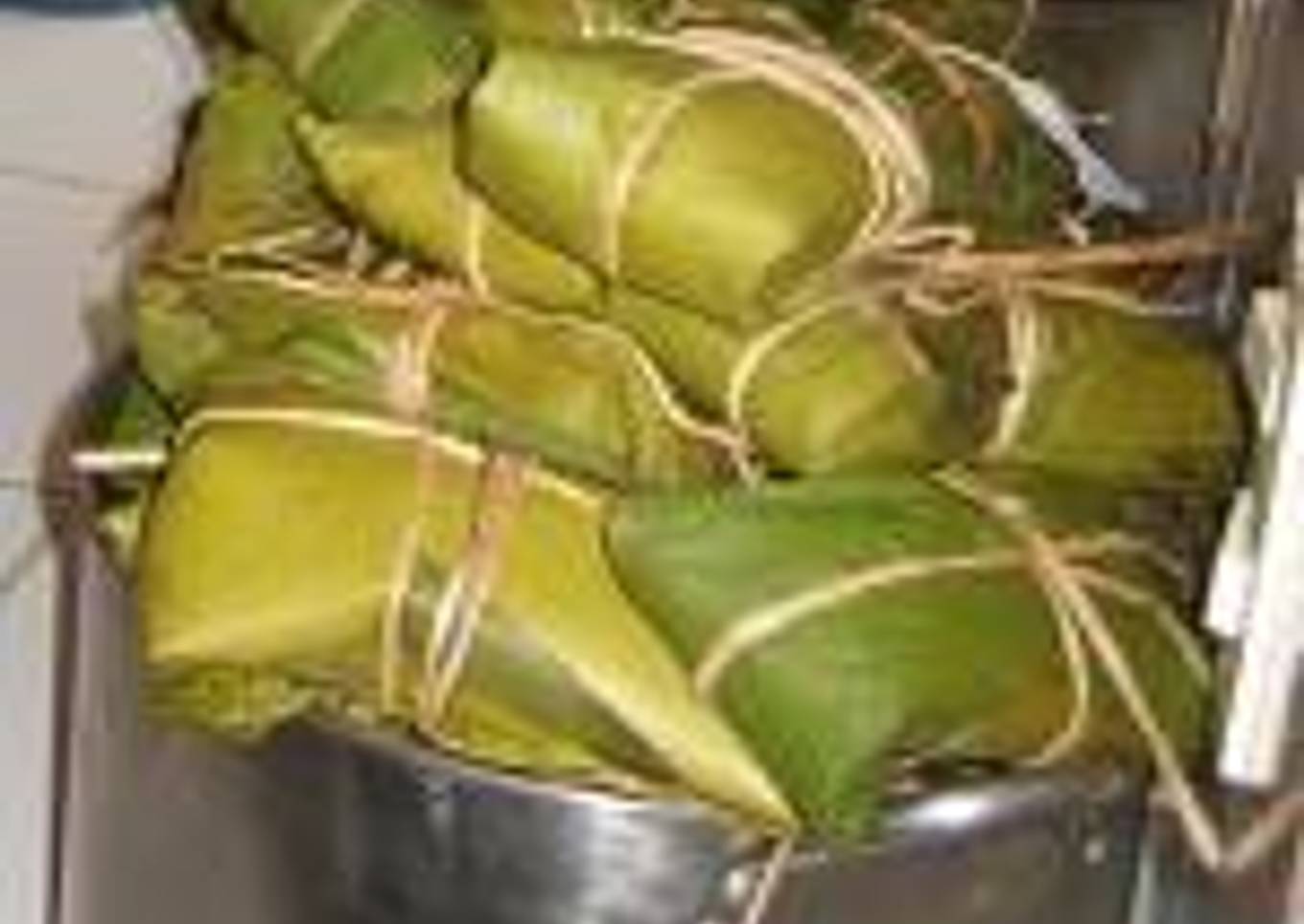 - Encima se ponen los garbanzos, el lomo, por pedazos, la costilla por pedazos, se envuelve el relleno con la misma masa formado una bola y se en vuelve en hojas de bijao y se amarra con cabuya de fique.