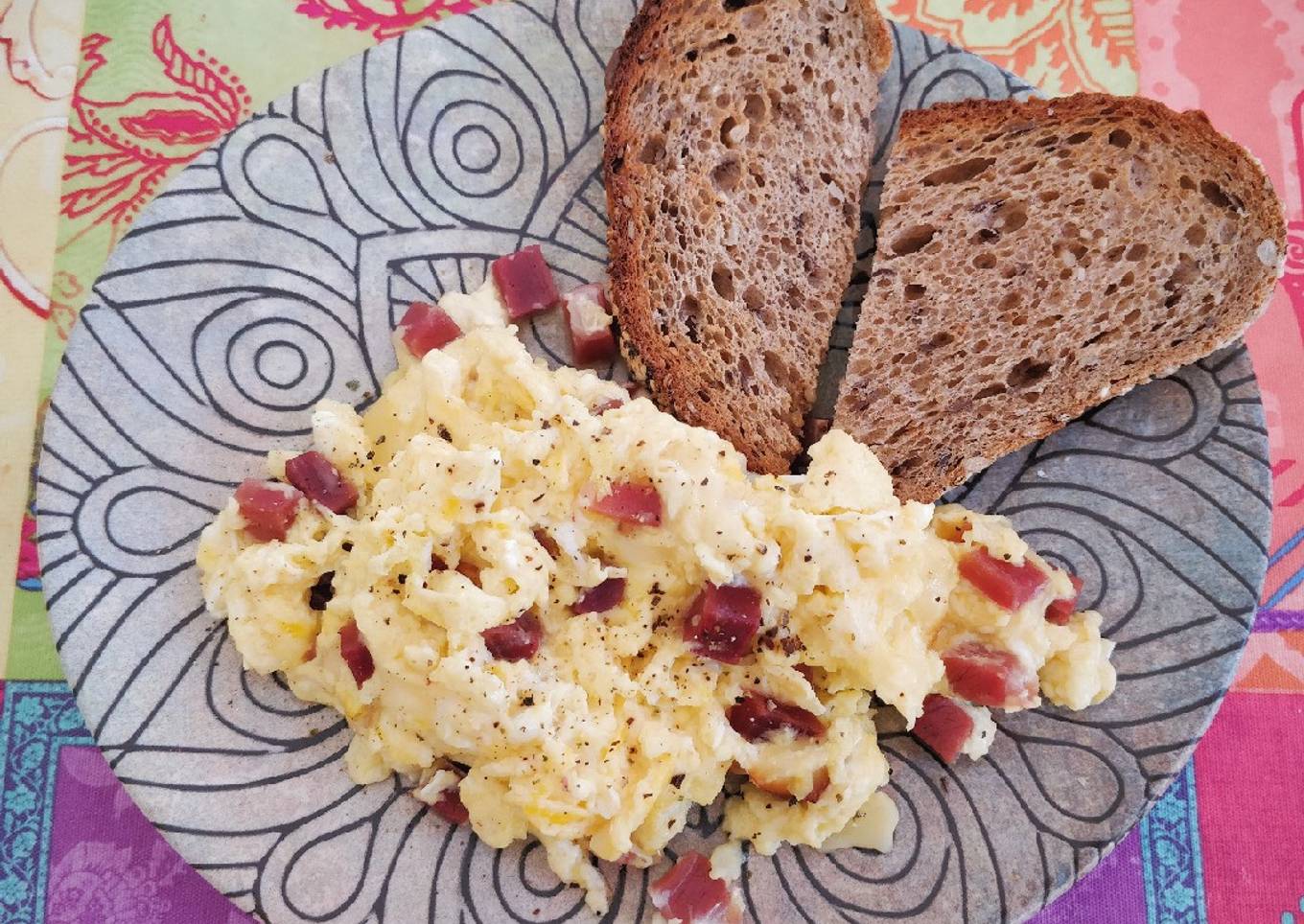- Batimos ligeramente dos huevos con un poquito de queso rallado y taquitos de jamón serrano. Asamos a la plancha sin parar de mover para que se queden esponjosos y ligeros.