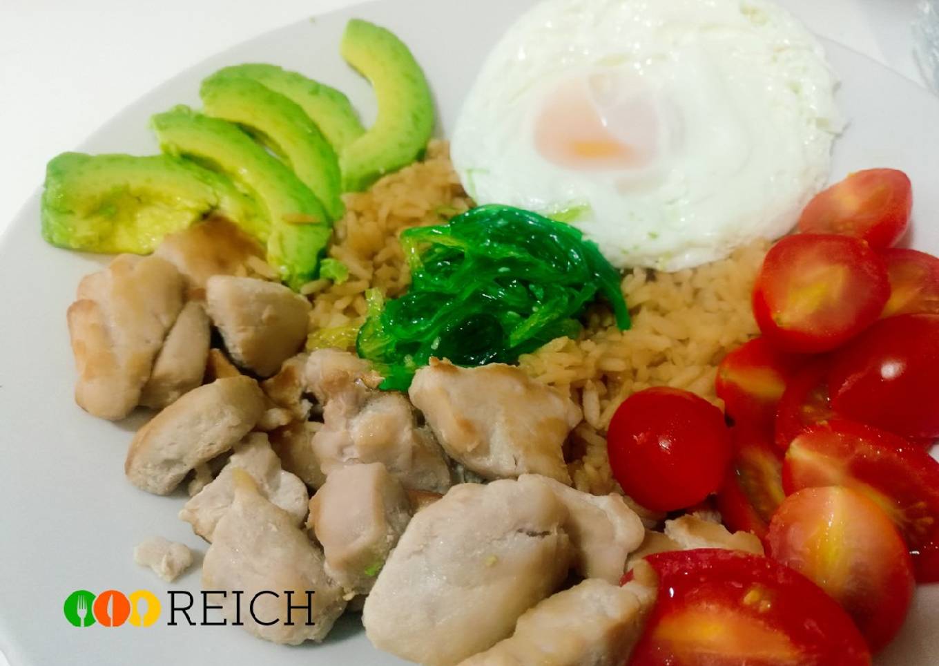 - Emplatar poniendo una ración de arroz, una de atún, un huevo, tomates y algas.