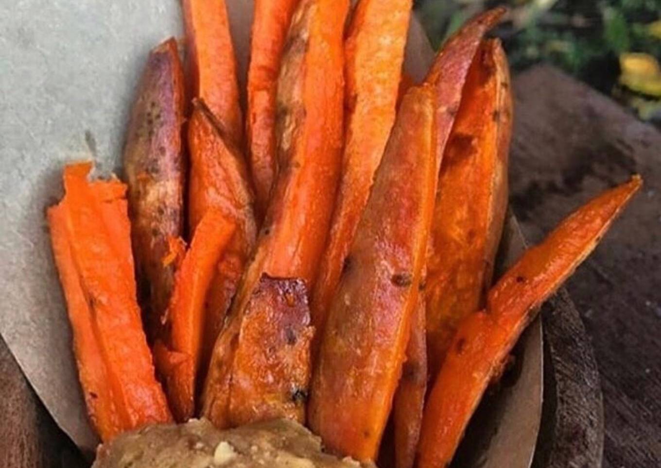 - 👉🏻Corta el boniato en tiras finas. Agrega el aceite + condimentos. Mezcla bien.